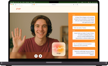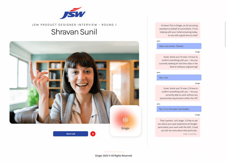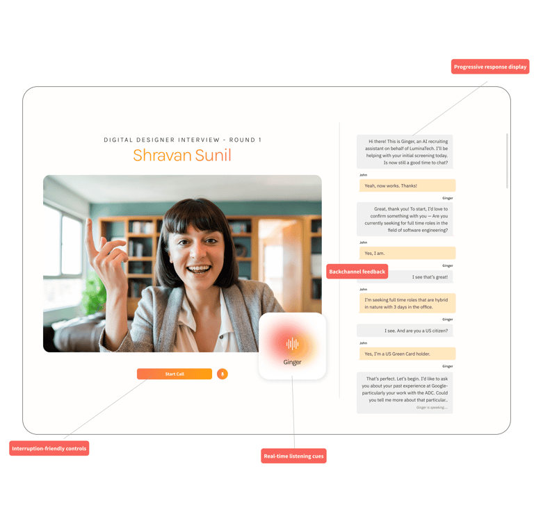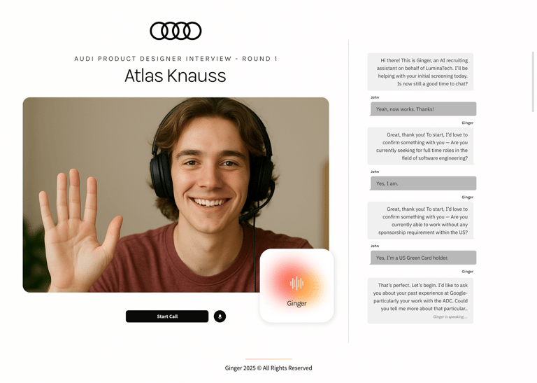 Ginger is an AI-driven voice recruiter used by companies to screen candidates through natural, human-like conversations. I joined as the founding designer to lead the end-to-end product design from research to UI, prototyping and conversational design.