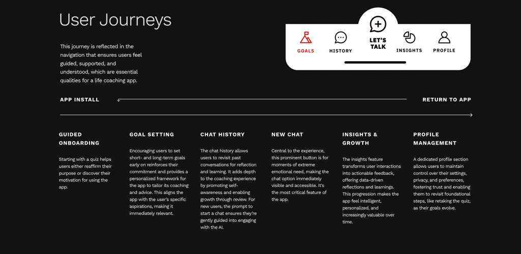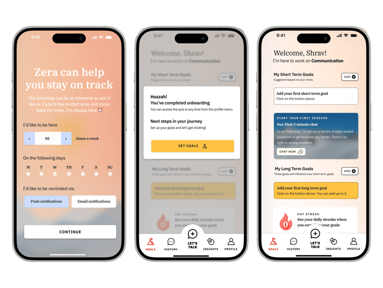 The homepage has been transformed to a goals page because it should always be the first thing the user sees when they open the app. Their goals will motivate them to talk more with the Zera AI and keep coming back to achieve their goals.